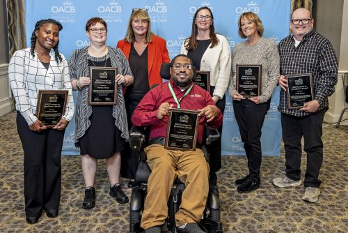 2025 Partners in Excellence Award (L-R): Latosha Olinger (Warren DD), Christine Brown (OSU Nisonger Center), Lisa Comes (OACB), Nate Turner (DODD), Jeanne Ehmke (Opportunities for Ohioans with Disabilities), Darenda Geer (DBS Consulting), and Keith Banner (DODD)